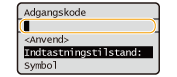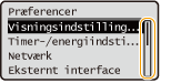 Du kan ændre en række forskellige skærmrelaterede indstillinger, såsom skærmsproget: <Visningsindstillinger> Du kan ændre den skærm, som vises automatisk, når maskinen forbliver i tomgang i et angivet tidsrum: <Funktion efter auto-nulstilling> Du kan ændre en række forskellige tilgængelighedsrelaterede indstillinger, såsom rullehastigheden: <Tilgængelighed> |