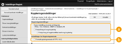 Hvis du vælger [Formatkrypteringsmetode til FIPS 140-2], kan du få TLS-kommunikationskrypteringsmetoden til at overholde USA's statsgodkendte FIPS (Federal Information Processing Standards) 140-2; der gælder dog følgende begrænsninger.