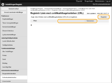 Klik på [Gennemse...], angiv filen (certifikattilbagekaldelseslisten), der skal registreres, og klik på [Registrér].