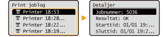 1 | I <Joblog> skal du vælge et element vælg det dokument, som du ønsker at kontrollere historik for.<OK> vises, når udskrivningen af et dokument var vellykket, og <Fejl> vises, når udskrivningen af et dokument mislykkedes, idet det blev annulleret, eller der var en eller anden fejl. ![]() Viser detaljerede oplysninger om dokumentet. |
