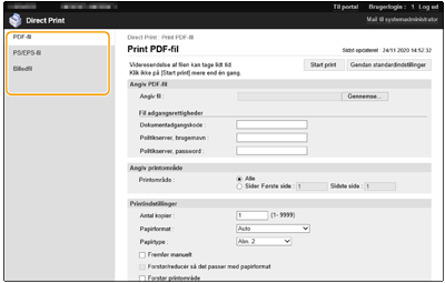 ![]() | Ved at bruge Remote UI (Brugerinterface til fjernbetjening) kan du printe filer, der er gemt på en computer eller et netværk, direkte fra maskinen uden at bruge printerdriveren. Du skal ikke åbne filerne på computeren for at printe dem. |