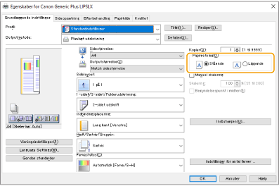 2 | På driverens [Grundlæggende indstillinger]-skærm skal du indstille [Papirretning] til den samme retning, som du har angivet i trin 1. |