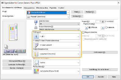 3 | Når du tjekker sideudskriften, kan du indstille [Sidelayout] [Siderækkefølge] [1-sidet/2-sidet/Folderudskrivning] [Indbindingsplacering]. |