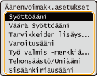 <Väärä Syöttöääni> | Ääni kuuluu virheellisen painiketoiminnon yhteydessä tai kun syötetään numero, joka on asetusalueen ulkopuolella |