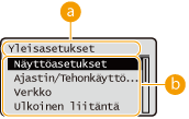 Tuo <Valikko>-näkymä näkyviin valitsemalla <Aseta>. Paina ensin tätä painiketta, jos haluat tehdä muutoksia jokaiseen asetukseen, kuten hallinta-, näyttö- ja verkkoasetuksiin.