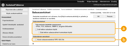 [Alusta salausmenetelmä FIPS 140-2:lle] ei ole käytettävissä, kun [CHACHA20-POLY1305] tai [X25519] on valittuna. Etäohjauksen käynnistäminen TLS:lläJos yrität käynnistää etäkäyttöliittymän TLS:n ollessa käytössä, suojausvarmennetta koskeva turvavaroitus voi tulla näkyviin. Tarkista tällöin, että osoitekenttään on syötetty oikea URL-osoite, ja jatka sitten etäkäyttöliittymän näkymän näyttämistä. Remote UI (Etäkäyttöliittymä) -sovelluksen käynnistys Erätuonti/erävientiTämä asetus voidaan tuoda/viedä malleissa, jotka tukevat tämän asetuksen erätuontia. Asetustietojen tuonti/vienti Tämä asetus sisältyy eräviennin kohtaan [Asetukset/tallennuksen perustiedot]. Kaikkien asetusten tuonti/vienti |