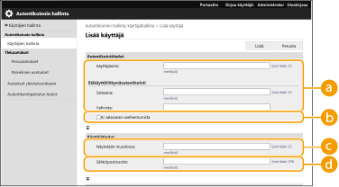 ![]() | Suorittaaksesi henkilökohtaisen autentikoinnin hallintaa, sinun on ensi tallennettava käyttäjätiedot laitteen tietokantaan. |