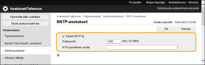 Valitse [Käytä SNTP:tä] ja määrittele tarvittavat asetukset.