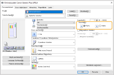 3 | Kun tarkistat tulostuksen esikatselun, määritä [Sivun asettelu] [Sivujärjestys] [1-puolinen/2-puolinen/Vihkotulostus] [Sidontakohta]. |