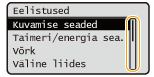 Saate muuta erinevaid kuvaga seotud sätteid, näiteks kuvamiskeel: <Kuvamise seaded> Saate muuta ekraani, mis kuvatakse automaatselt, kui seade jääb teatud aja jooksul jõudeolekusse: <Funktsioon pärast automaatset lähtestust> Saate muuta erinevaid juurdepääsuga seotud sätteid, näiteks kerimise kiirus: <Juurdepääs> |