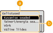 Kuval <Avakuva> kuvatavad üksused<Menüü> kuva