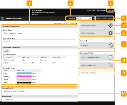 Kui logite sisse Remote UI (kaugkasutajaliidesesse), kuvatakse allpool kuvatud portaalileht. Selles jaotises kirjeldatakse portaalilehel kuvatavaid üksusi ja põhitoiminguid.