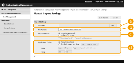 Täieliku importimise korral kustutatakse masinast kõik imporditud failides loetlemata kasutajad. Küll aga jäävad „-----” ja „Administrator”, mis on vaikimisi registreeritud, isegi siis, kui neid imporditud failides ei ole.