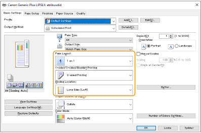 3 | Prindi eelvaadet vaadates määrake [Page Layout] [Page Order] [1-sided/2-sided/Booklet Printing] [Binding Location]. |