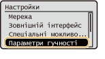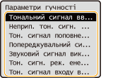 <Тон. сигн. реж. енергозб./сну> | Звук, який лунає, коли апарат вмикає режим сну чи вимикається, коли для параметра <Параметри швидк. запуску для ел. живл.> встановлено значення <Увімк.>. (Залежно від ситуації апарат може не запускатися швидко, а звук не лунати.) |
