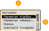 Виберіть <Уст.>, щоб відобразити екран <Меню>. Спочатку натисніть цю кнопку, щоб внести зміни для кожного параметра, як-от параметри керування, відображення й мережі.
