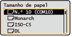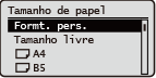 Colocar papel no tabuleiro multifunçõesÉ apresentado o ecrã que lhe permite especificar o formato e o tipo de papel.