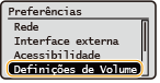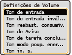 <Tom modo poup. ener./Suspensão> | Som produzido quando a máquina entra no modo Sleep ou quando a máquina é desligada, se programar <Defs. Arranque Rápido p/Aliment. Princ.> para <Ligado>. (Dependendo das situações, a máquina não arranca rapidamente nem emite qualquer tom.) |