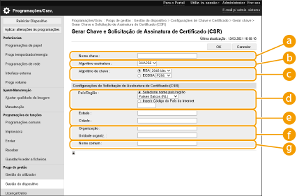 Pode gerar uma chave e CSR na máquina. Também pode apresentar os dados da CSR no ecrã e exportá-los como um ficheiro.