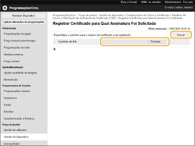 Clique em [Procurar...], especifique o ficheiro (certificado) que pretende gravar e clique em [Gravar].