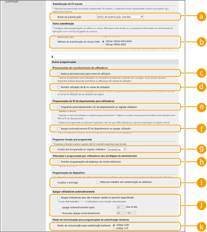 Selecione a caixa de verificação para atribuir automaticamente uma ID de departamento quando gravar/editar um utilizador através da Remote UI (UI Remota). Não será atribuída uma nova ID de departamento se já tiver sido atribuída uma. Esta programação só pode ser especificada a partir da Remote UI (UI Remota).