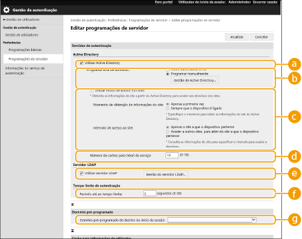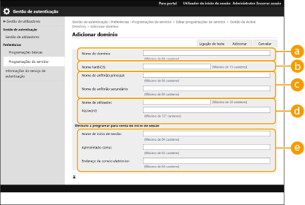 4 | Introduza as informações necessárias. ![]() [Nome do domínio:]Introduza o nome do domínio do Active Directory que corresponde ao destino de início de sessão (exemplo: empresa.domínio.com). [Nome NetBIOS]Introduza o nome do domínio NetBIOS (exemplo: empresa). [Nome do anfitrião principal:] / [Nome do anfitrião secundário:]Introduza o nome do anfitrião do servidor do Active Directory (exemplo: ad-server1). Quando utilizar um servidor secundário, especifique o nome em [Nome do anfitrião secundário:]. [Nome de utilizador:] / [Password:]Introduza o nome do utilizador e a palavra-passe utilizados para aceder e procurar no servidor do Active Directory. [Nome de início de sessão:] / [Apresentado como:] / [Endereço de correio eletrónico:]Especifique os campos de dados (nomes dos atributos) para o nome de início de sessão, o nome de apresentação e o endereço de correio eletrónico de cada conta de utilizador no servidor do Active Directory (exemplo: sAMAccountName, cn, mail). |