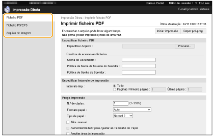 ![]() | Utilizando a Remote UI (UI Remota), é possível imprimir os ficheiros gravados num computador ou numa rede diretamente a partir da máquina sem utilizar o controlador da impressora. Não precisa de abrir os ficheiros no computador para a impressão. |