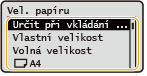Pokud potřebujete vkládaný papír často měnit, vyberte možnost <Volná velikost>; zjednodušíte tak postup, který se provádí při každé změně nastavení. Když je velikost papíru nastavená v ovladači tiskárny výrazně odlišná od velikosti skutečně vkládaného papíru, můžete také nastavit, aby se zobrazilo chybové hlášení.