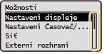 Máte možnost změnit celou řadu nastavení zobrazovaných na displeji, jako je jazyk zobrazování: <Nastavení displeje> Můžete změnit obrazovku, která se automaticky zobrazí poté, co je zařízení po určenou dobu v nečinnosti: <Funkce po autom. resetování> Máte možnost změnit celou řadu nastavení pro zjednodušení přístupu, jako je rychlost posouvání obrazovky: <Dostupnost> |