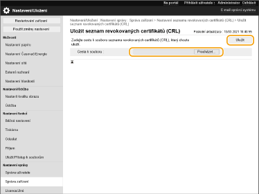 Klikněte na [Procházet...], zadejte soubor (CRL – seznam zneplatněných certifikátů), který chcete uložit, a klikněte na [Uložit].