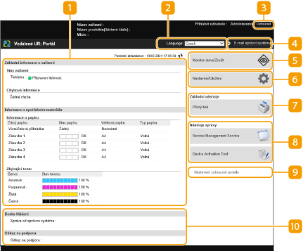 Když se přihlásíte do Remote UI (Vzdálené uživatelské rozhraní), zobrazí se níže uvedená portálová stránka. V této části jsou popsány položky zobrazované na portálové stránce a základní operace.