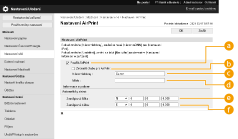 Pokud se přihlásíte s právy administrátora, můžete nastavení služby AirPrint měnit také z obrazovky služby AirPrint.