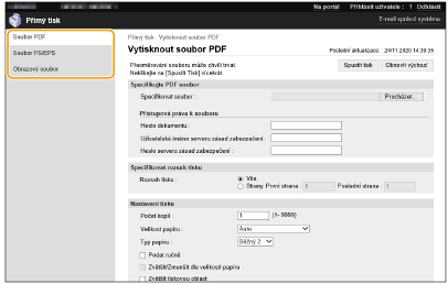 ![]() | S pomocí Remote UI (Vzdálené uživatelské rozhraní) lze tisknout soubory uložené v počítači nebo na síti přímo ze stroje bez použití ovladače tiskárny. Pro tisk nemusíte otvírat soubory v počítači. |