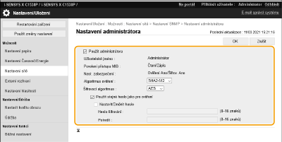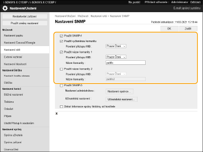 SNMP (Simple Network Management Protocol) je protokol určený k monitorování a ovládání komunikačních zařízení v síti pomocí funkce MIB (Management Information Base). Zařízení podporuje protokol SNMPv1 a protokol SNMPv3 s vylepšenými funkcemi zabezpečení. Stav zařízení lze zkontrolovat z počítače při tisku dokumentů nebo pomocí Vzdáleného uživatelského rozhraní. Můžete povolit buď protokol SNMPv1, nebo SNMPv3, případně oba současně. U každé verze zadejte nastavení odpovídající síťovému prostředí a účelům používání.