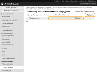 Kattintson a [Tallózás...] lehetőségre, adja meg a bejegyzendő fájlt (CRL), majd kattintson a [Bejegyzés] lehetőségre.