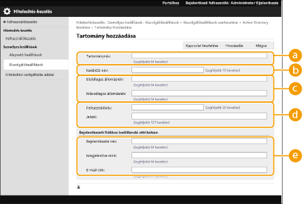 4 | Adja meg a szükséges információt. ![]() [Tartománynév:]Írja be a bejelentkezési rendeltetési helyként használandó Active Directory tartománynevét (Példa: vallalat.tartomany.hu). [NetBIOS-név]Írja be a NetBIOS tartománynevet (Példa: vallalat). [Elsődleges állomásnév:] / [Másodlagos állomásnév:]Írja be az Active Directory-kiszolgáló állomásnevét (Példa: ad-kiszolgalo1). Ha másodlagos kiszolgálót is használ, ennek a nevét a [Másodlagos állomásnév:] mezőben adja meg. [Felhasználónév:] / [Jelszó:]Az Active Directory-kiszolgálóhoz való hozzáféréshez és az azon végzett kereséshez használandó felhasználónevet és jelszót írhatja be. [Bejelentkezési név:] / [Megjelenítve mint:] / [E-mail-cím:]Az Active Directory-kiszolgálón található egyes felhasználói fiókok bejelentkezési nevéhez, megjelenítési nevéhez és e-mail-címéhez tartozó adatmezőket (attribútumneveket) adhatja meg (Példa: sAMAccountName, cn, mail). |