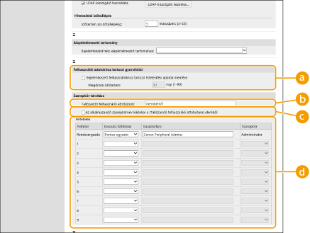 [Karakterlánc] | A [Tallózandó felhasználói attribútum:] elemben megadott attribútumhoz bejegyzett karakterláncot írhatja be. Ha a jogosultságokat a felhasználó csoportja alapján akarja beállítani, írja be a csoport nevét. |