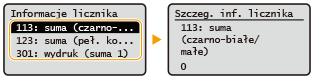 Można osobno sprawdzić łączną liczbę stron użytych do wydruków w kolorze oraz w trybie czarno-białym. Liczba wydrukowanych stron uwzględnia wydruki z nośnika pamięci i listy, a także wydruki z komputerów.