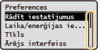Varat mainīt dažādus ar displeju saistītus iestatījumus, piemēram, displeja valodu: skatiet sadaļu <Rādīt iestatījumus> Mainiet ekrānu, kas automātiski tiek parādīts, ja iekārta norādītu laika periodu atrodas dīkstāvē: skatiet sadaļu <Funkcija pēc autom. atiestatīšanas> Varat mainīt dažādus ar pieejamību saistītus iestatījumus, piemēram, ritināšanas ātrumu: skatiet sadaļu <Pieejamība> |