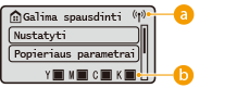 Rodoma, kiek dažomųjų miltelių liko kasetėse. Jie nerodomi, kai atliekami veiksmai ekrane <Pagrindinis>.