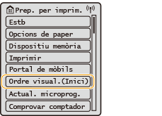 Podeu canviar les opcions corresponents a la visualització de la pantalla, com ara la pantalla que apareix immediatament després d'engegar l'equip i si apareix el missatge de paper tòner i restant. <Opcions de visualització> |