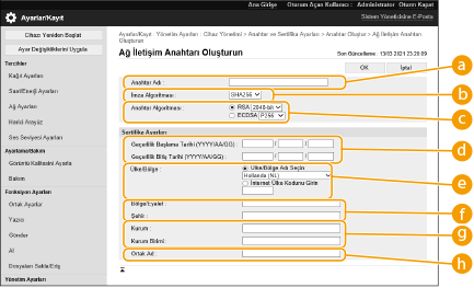 [Anahtar Algoritması]Anahtar oluşturma algoritması olarak [RSA] veya [ECDSA] seçeneğini belirleyin. [RSA] seçtiyseniz anahtar uzunluğunu; [ECDSA] seçtiyseniz anahtar türünü seçin. Her iki durumda da değer yükseldikçe güvenlik artar ancak iletişim işleme hızı azalır.