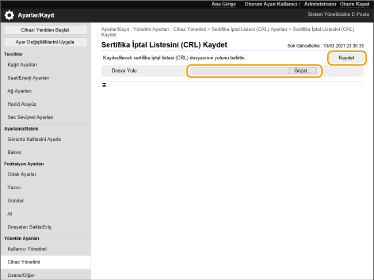 Bir sertifika iptal listesi (CRL) kaydetmek için Uzak Kullanıcı Arabirimi'ni kullanabilirsiniz. Makine üzerinde kaydedilebilecek CRL’ler hakkında bilgi için bkz.