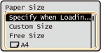 بعد از ثبت تنظیمات کاغذ پیشفرض، صفحه تنظیم کاغذ زمان بارگذاری کاغذ نشان داده نمیشود و همیشه از همان تنظیمات استفاده میشود. اگر بدون تغییر تنظیمات کاغذ، از کاغذ دیگری با اندازه و نوع متفاوت استفاده کنید، ممکن است دستگاه بهدرستی چاپ نکند. برای جلوگیری از این مشکل، <Specify When Loading Paper> در مرحله 3 را انتخاب و سپس کاغذ را بارگذاری کنید. |