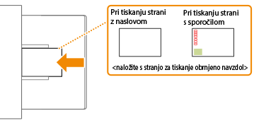 V tem razdelku je opisano, kakšna je pravilna usmerjenost dopisnic pri nalaganju, navedeni pa so tudi postopki, ki jih morate opraviti pred nalaganjem dopisnic. Opis splošnega postopka nalaganja dopisnic v večnamenski pladenj je na voljo v razdelku Osnovni način nalaganja papirja. |