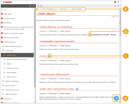 Faceţi clic pentru a specifica setări precum dimensiunea textului, aspectul şi metoda de afişare pentru Ghidul utilizatorului.