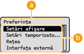 Selectaţi <Setare> pentru a afişa ecranul <Meniu>. Apăsaţi mai întâi acest buton pentru a modifica fiecare setare, precum setările de gestionare, setările de afişare şi setările de reţea.
