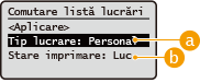 Când sunt reţinute mai multe lucrări, sunt imprimate în ordinea de afişare pentru <Data>. La o singură operaţie de conectare pot fi imprimate până la 100 de lucrări. |