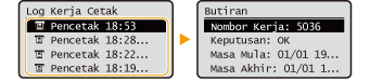 1 | Dalam <Log Kerja>, pilih item pilih dokumen untuk menyemak sejarahnya.<OK> dipaparkan apabila dokumen berjaya dicetak dan <Error> dipaparkan apabila dokumen gagal dicetak kerana ia telah dibatalkan atau terdapat beberapa ralat. ![]() Memaparkan maklumat terperinci tentang dokumen. |