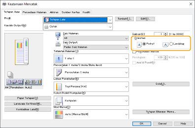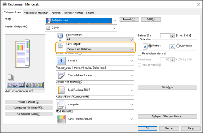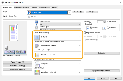 3 | Semasa menyemak pratonton cetak, tetapkan [Tataletak Halaman] [Urutan Halaman] [Pencetakan 1 muka/2 muka/Buku kecil] [Lokasi Pengikatan]. |